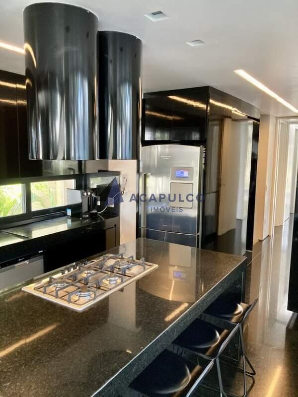A cozinha e banheiros possuem piso, revestimentos e bancadas em granito preto.